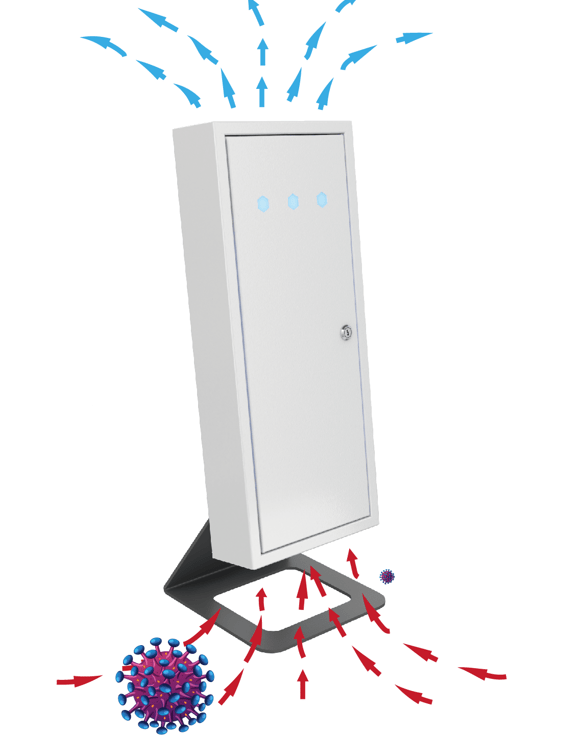 Воздух из помещения прокачивается через рециркуляционный модуль обеззараживания благодаря установленным внутри бесшумным вентиляторам.