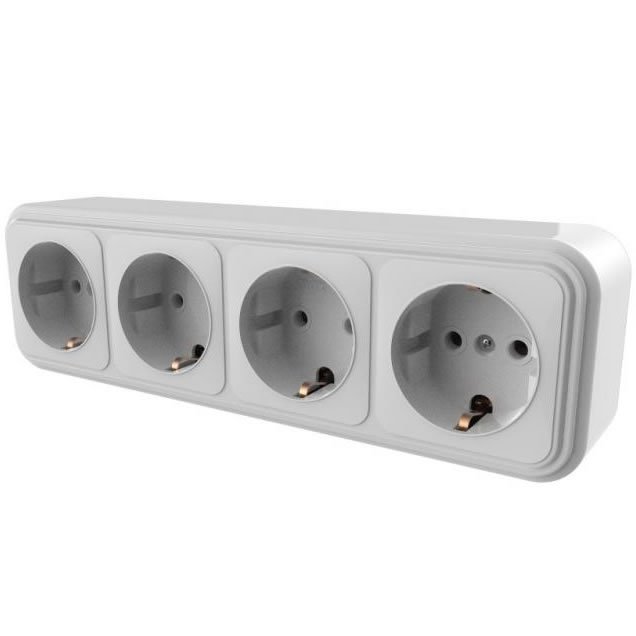 Четырехместная розетка штепсельная двухполюсная открытой установки с заземляющим контактом предназначена для присоединения электрических приемников с номинальным напряжением 250 В к электрической сети переменного тока в нормальных климатических условиях внешней среды по ГОСТ 15150 и ГОСТ 15543.1.
